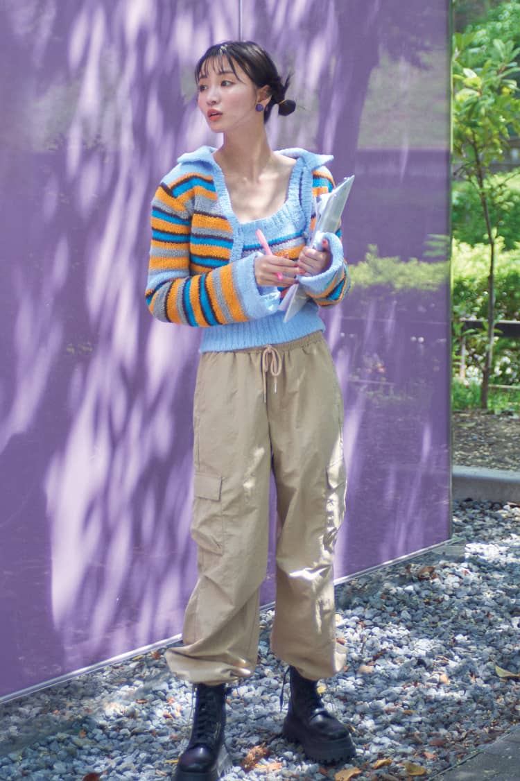 トレンドカーゴパンツを使ったコーデ。キャミと同じ素材のカーディガンの組みあわせで抜け感を演出!カラフルなトップスには、シンプルなパンツをあわせてバランスの取れたコーデ仕上げて。足元はレースアップブーツを選んでメリハリのあるシルエットに♡