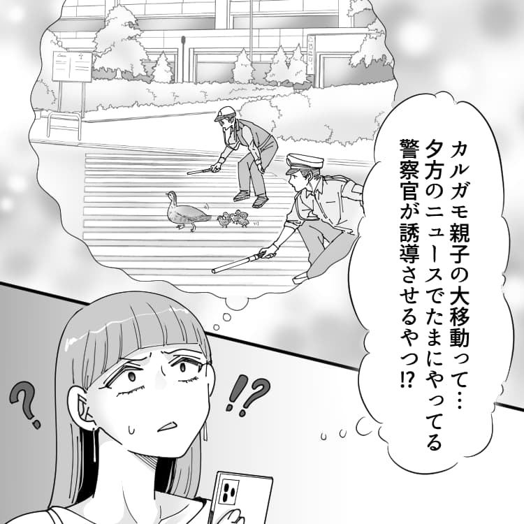 「カルガモ親子の大移動の誘導をしていた」と、明らかにわかるウソをつかれて頭を抱える主人公。