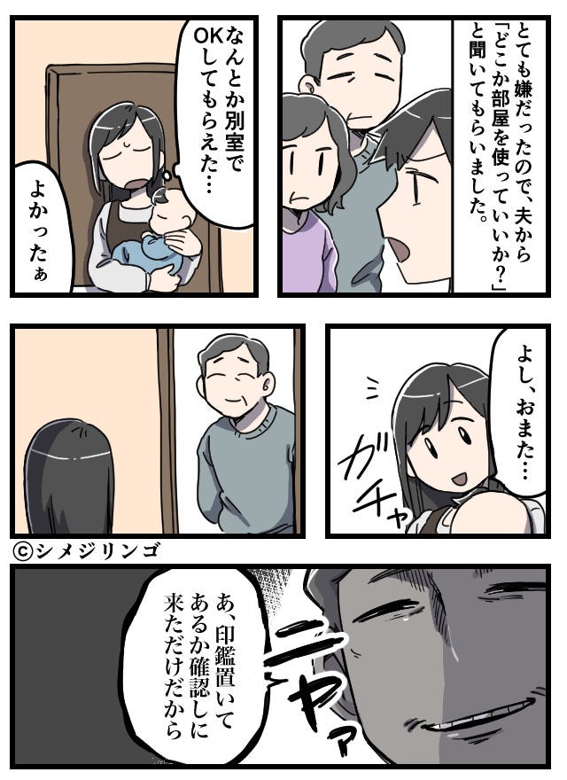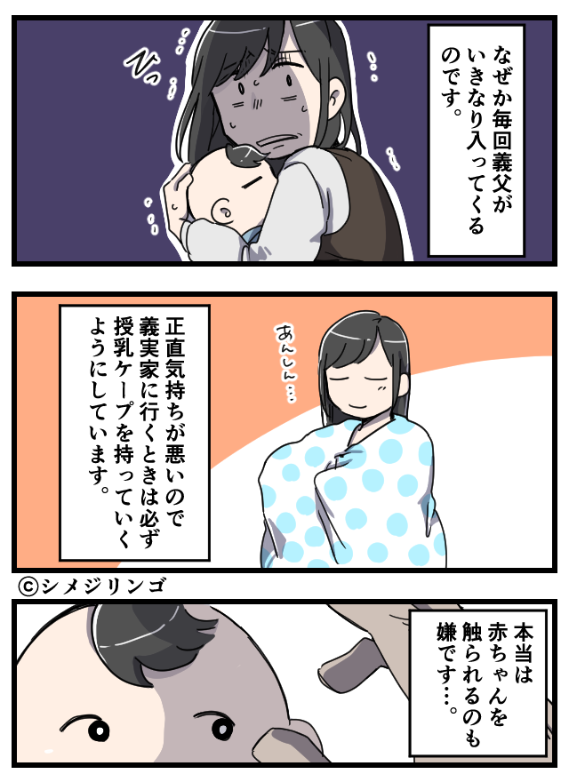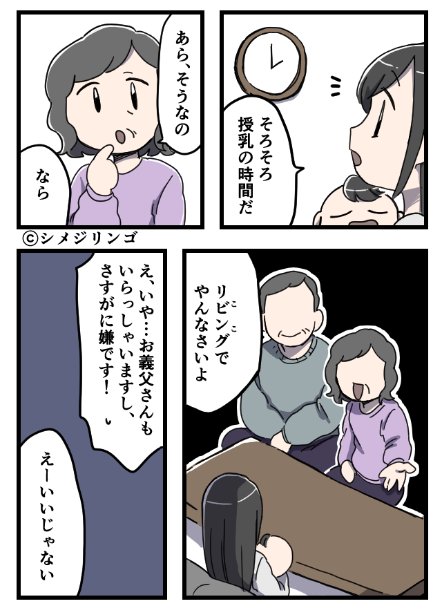 義父も用事があるのかもしれませんが、授乳中は母親も赤ちゃんも安心できるように配慮してほしいものです。