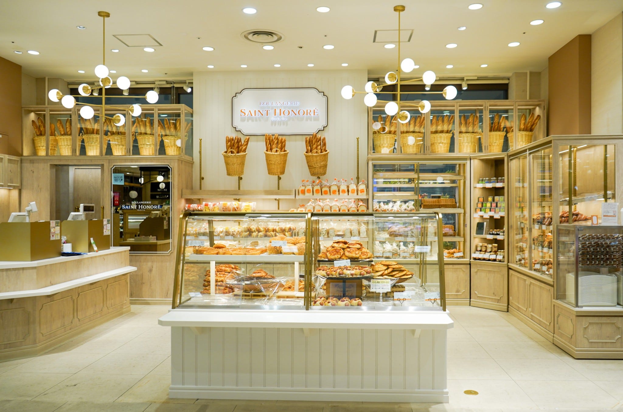 ドンク新ブランド「サントノーレ」は阪急うめだ本店地下1階の御堂筋側出入り口すぐそばにあり、木目調の明るい店内には、眺めているだけでもワクワクするようなパンメニューがふんだんに並びます。