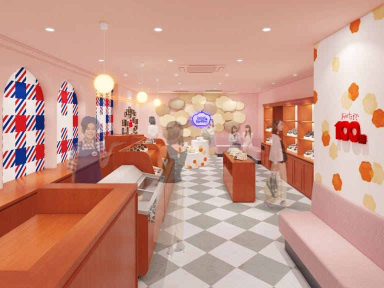 ヒロタ 大阪・えびすばし店 店内イメージ 戎橋筋商店街にある「ヒロタ 大阪・えびすばし店」は、チェック柄のレトロなオーニングが目印。カラフルなシュークリームのディスプレイや、大量のシュークリームモチーフでデザインされた壁など、シュークリームのかわいさをギュッと詰め込んでいます。