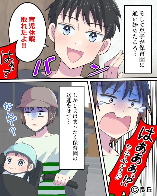 育児休暇が夫のリフレッシュ休暇になっていたことに、納得がいかない主人公なのでした。