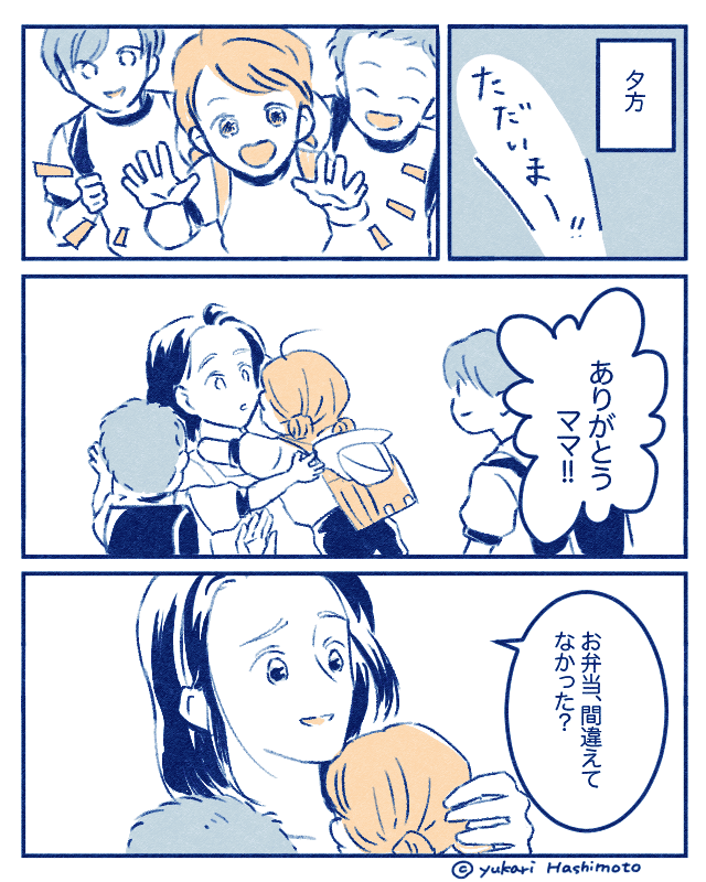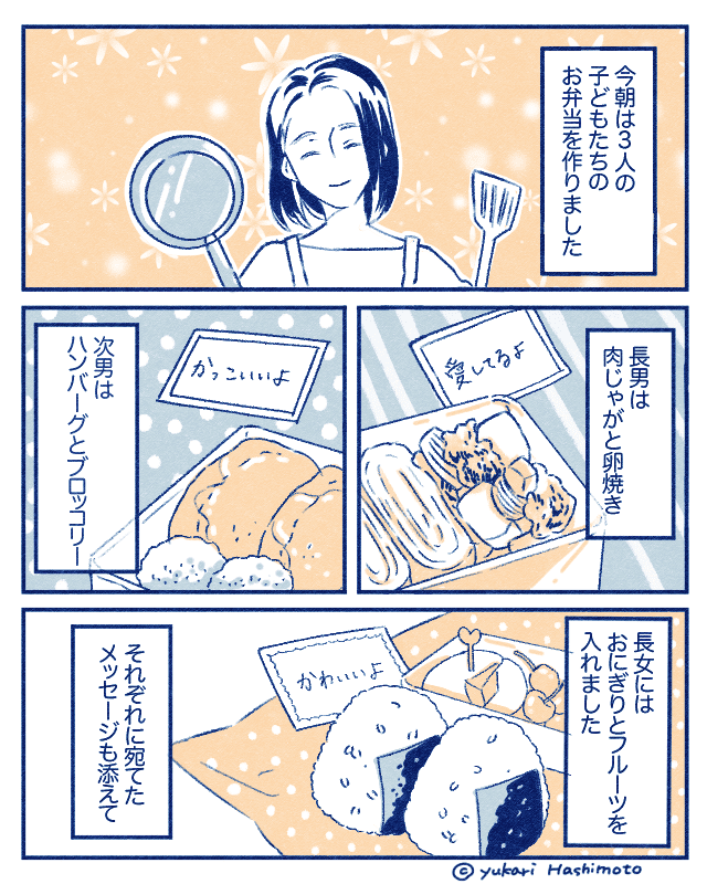 3人の子どものために、メッセージ付きのお弁当を用意した主人公。