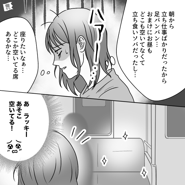 仕事帰りに、電車で空いてる席を見つけ、やっとの思いで座れた主人公。