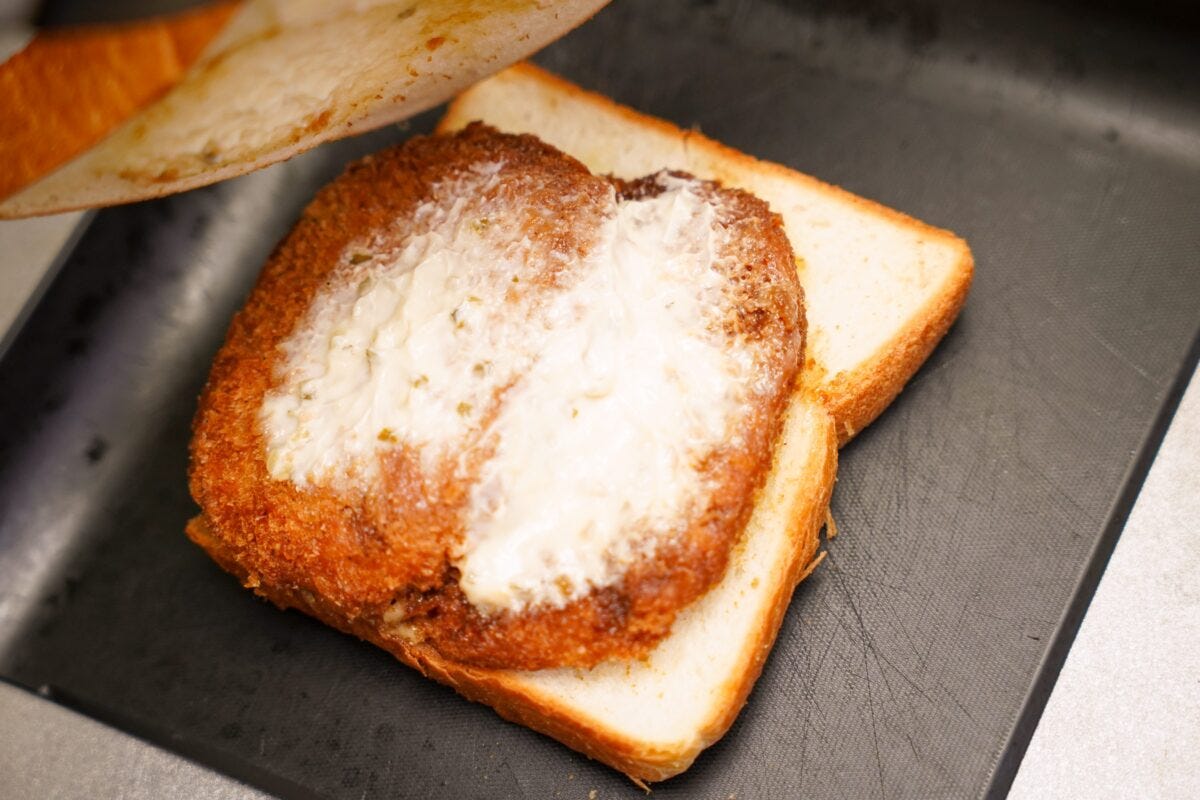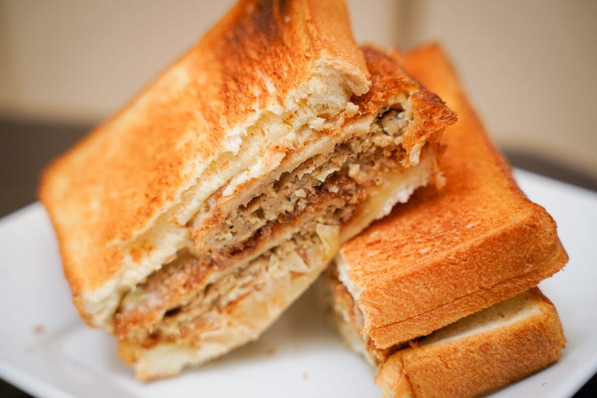 対する「キャベツメンチカツサンド」は先程の「チョコドーナツサンド」を超えたハイカロリー商品。キャベツメンチカツ2個、ポテトサラダ、マヨネーズ、タルタルソースを2枚のトーストでサンドしていて、明らかにボリューミー。