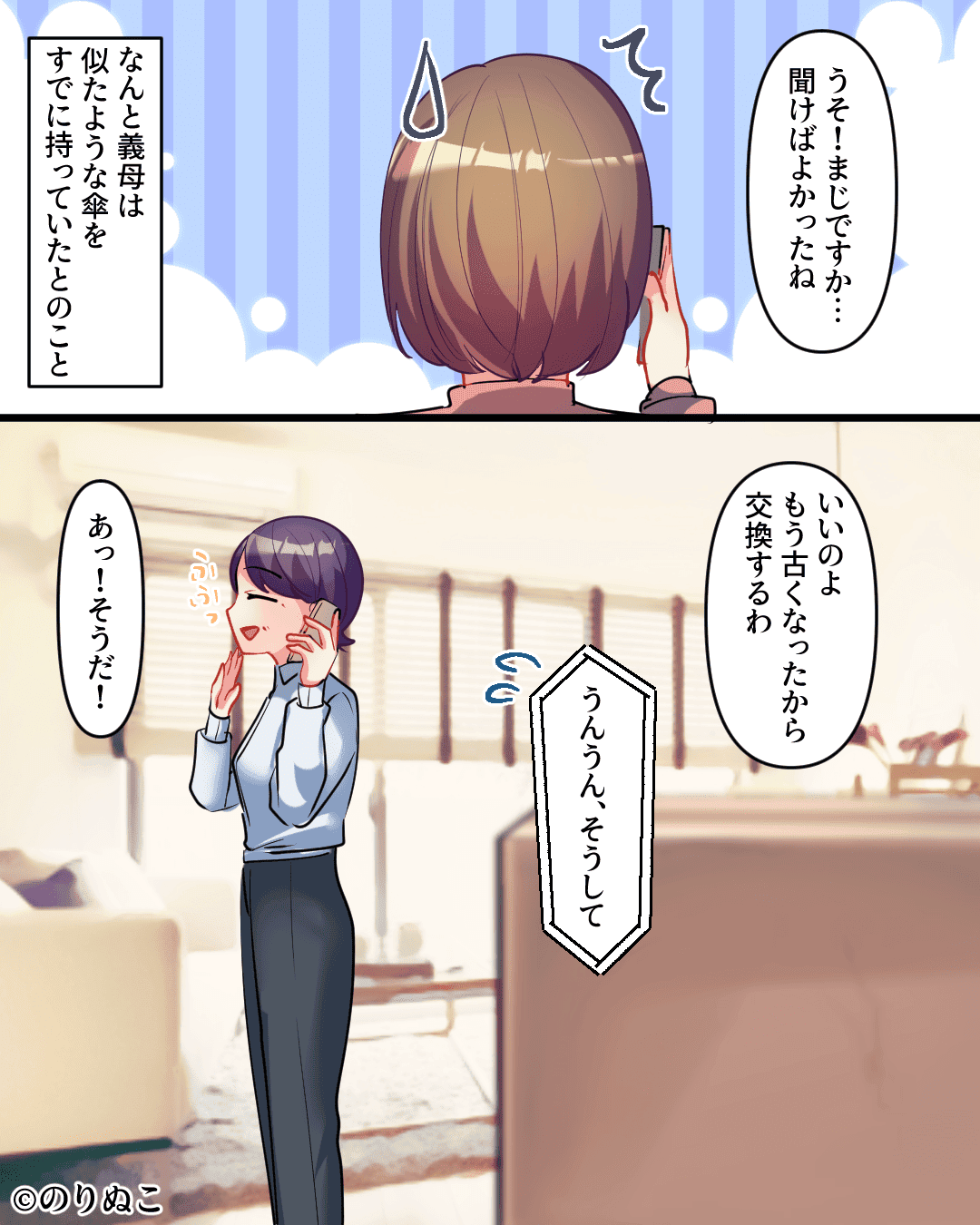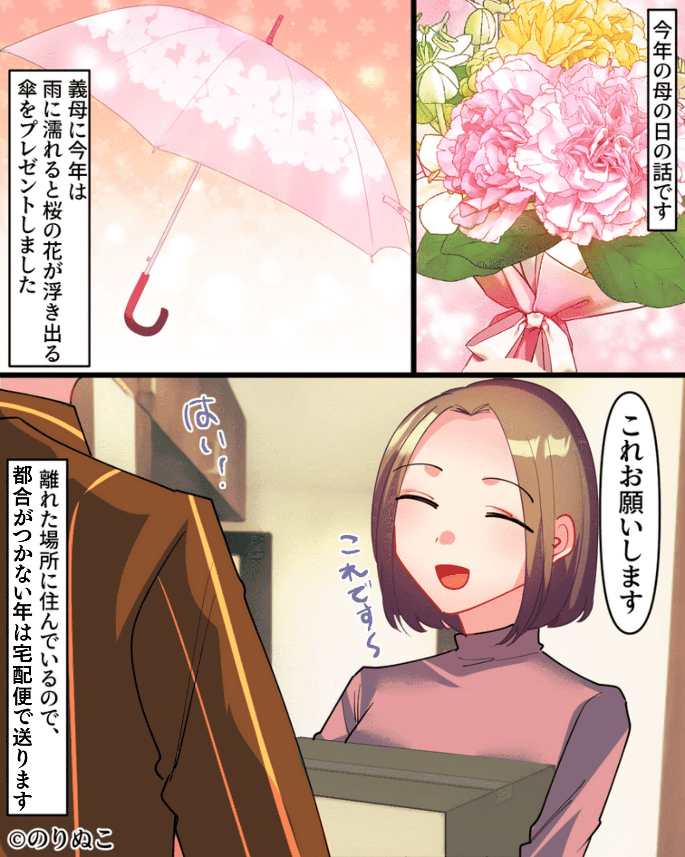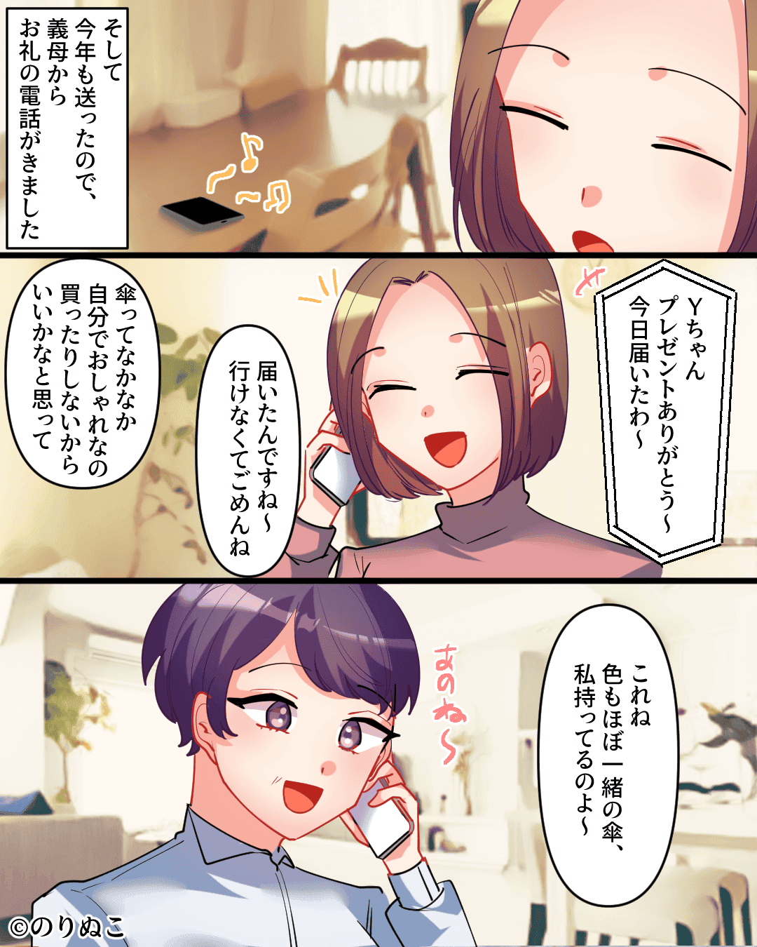 義母が持っている傘と、プレゼントがかぶってしまったようですね。