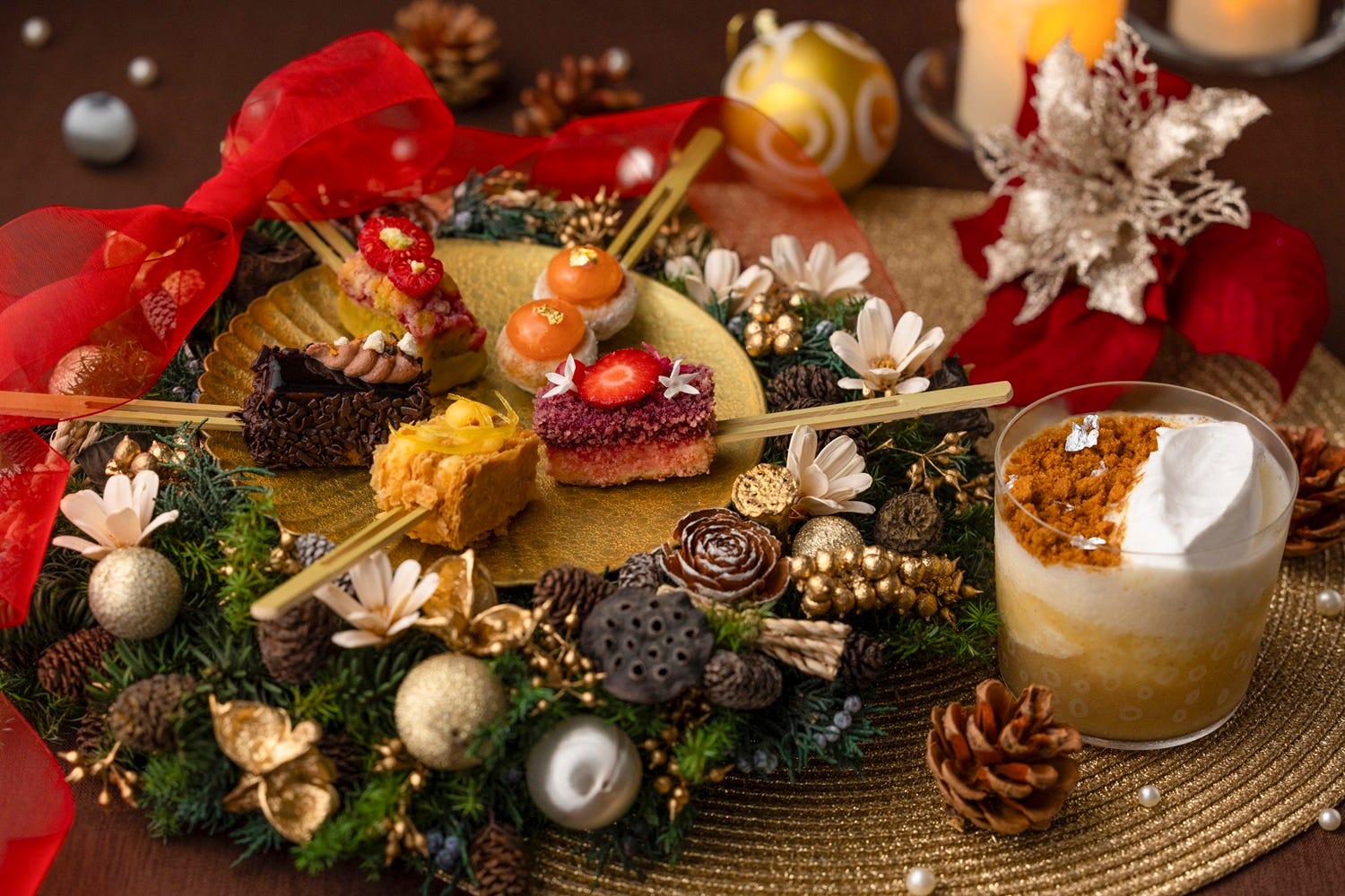 「串スイーツ」1,500円(数量限定)/内容:カカオのビュッシュドノエル、ピスタチオとフランボワーズのタルト、ブールドネージュ、ベリーチーズケーキ、柚子のミルフィーユ/提供時間:15:00~21:00/提供場所:OMOカフェ&バル 「串スイーツ」には、「ビュッシュドノエル」をアレンジし、ショコラで串カツの衣を表現したスイーツや、うずら串カツの形や黄身を表現した「ブールドネージュ」など、見た目にもユニークな全5種がラインアップ。リースに乗せて提供されるので、クリスマスムードも一気に高まります。