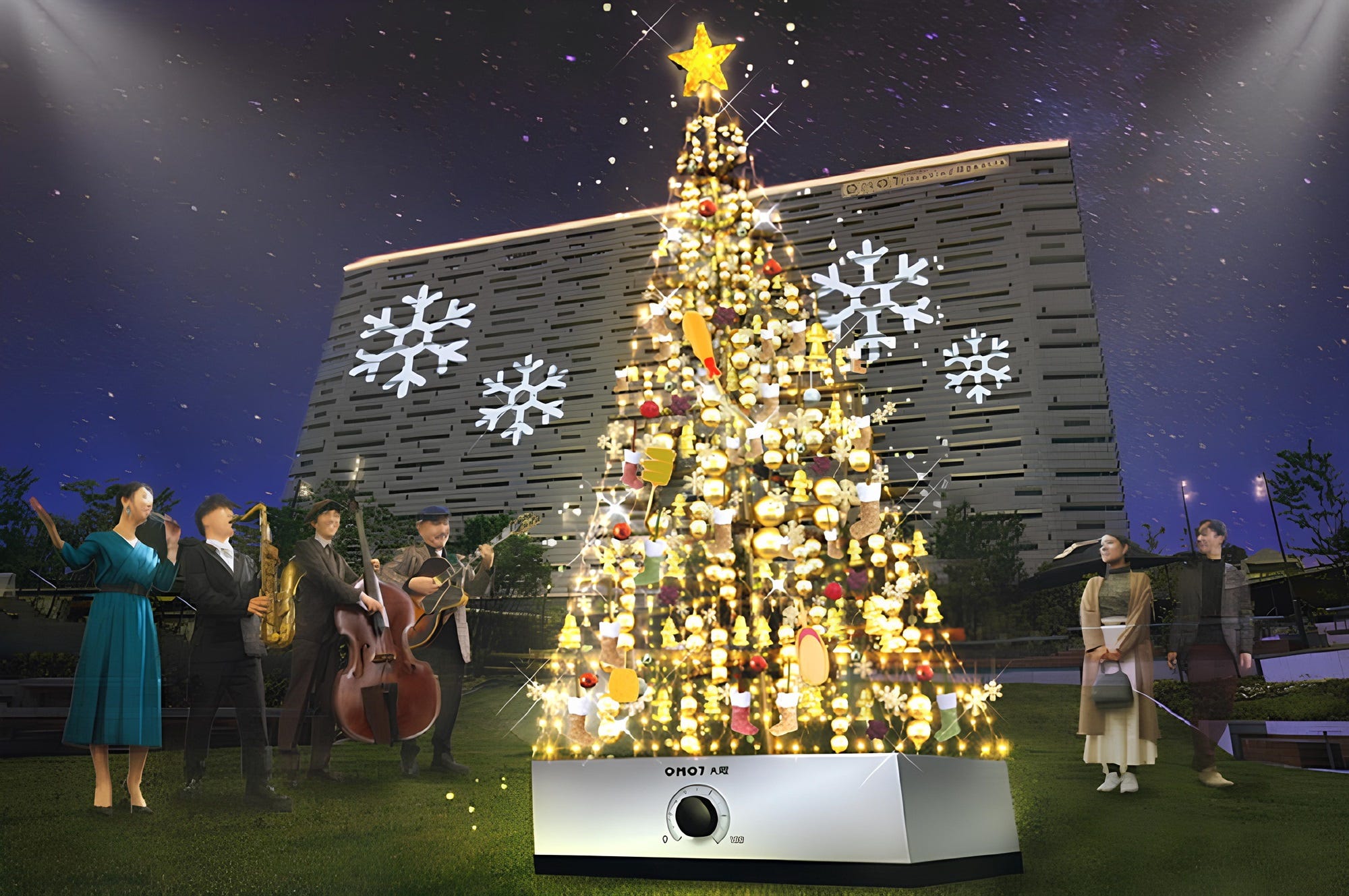 さらに、毎日21時からは、ホテルの外装を覆う膜をクリスマスをテーマにした演出照明でデコレーション。そばにはライトアップされた串カツツリーも輝き、思わずスイングしたくなるような音楽を聴けば、盛り上がること間違いなし!