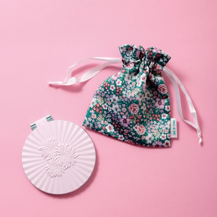 ポール&ジョー ビューティー ミラー Ⅳ(発売中)メイクチェックをスマートに♡ 人気のミラーがホリデー仕様のピンクと裏面はペールグリーンをまとって登場。持ち運びやすい薄型ミラーは、のぞき込む姿をエレガントに見せてくれます。なつかしい雰囲気のフラワープリントの巾着もステキ。