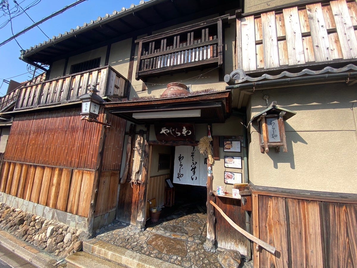 「わらじや」は創業400年以上の歴史をもつ老舗のお店で、豊臣秀吉が方広寺に出向いた際に"わらじ”を脱いで休憩していたことから「わらじや」という名がついたそうです。お店の入り口にも、大きな"わらじ”が飾られています。