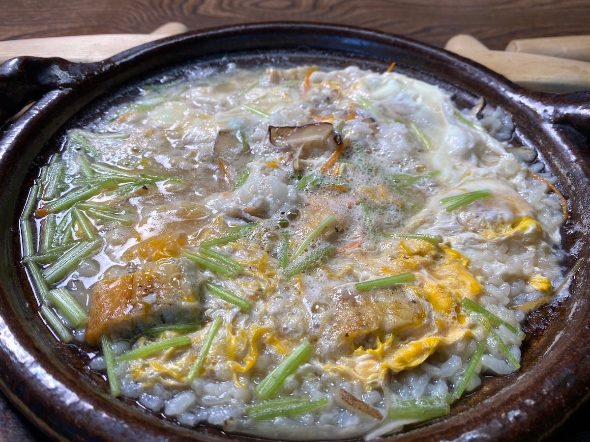 お鍋の〆には、白焼きのうなぎが入った雑炊「うぞふすい」をいただきました。お米だけではなくお餅が入っているのが特徴です。