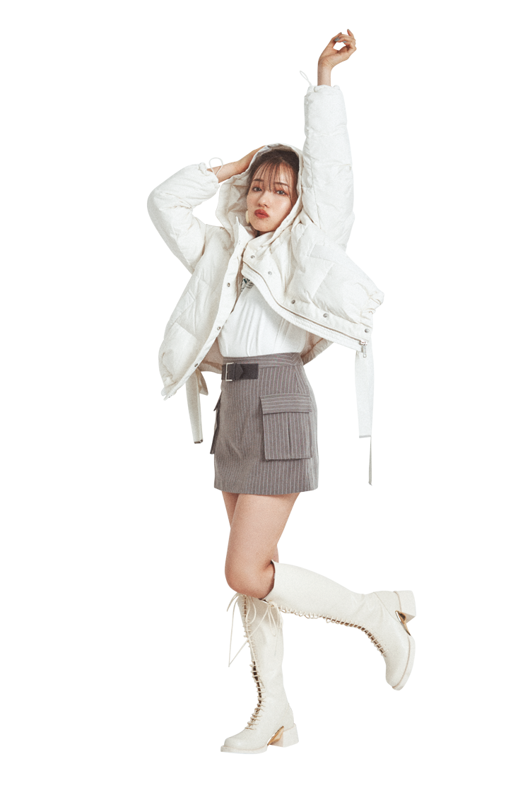 白多めのシンプルなコーデ。あえてシメ色を使わず、イエベ調のほわ色でまとめるのが顔映えするコツ。ミニスカ×ロングブーツでスタイルアップも期待できる♡ ミニ丈のアイテムをあわせると白でも膨張しないよ!