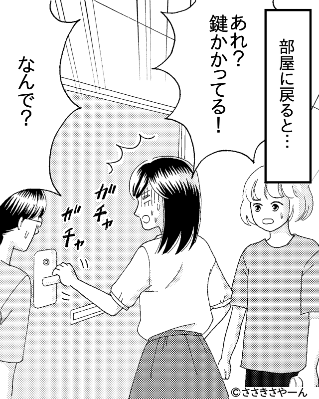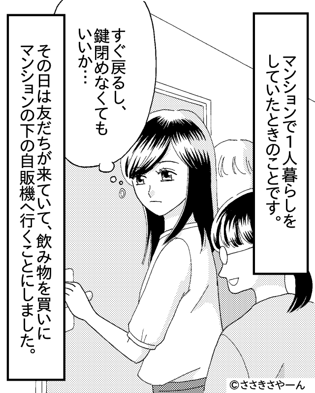 鍵を閉めずに出たはずなのに、戻ると鍵がかかっていた主人公の自宅。