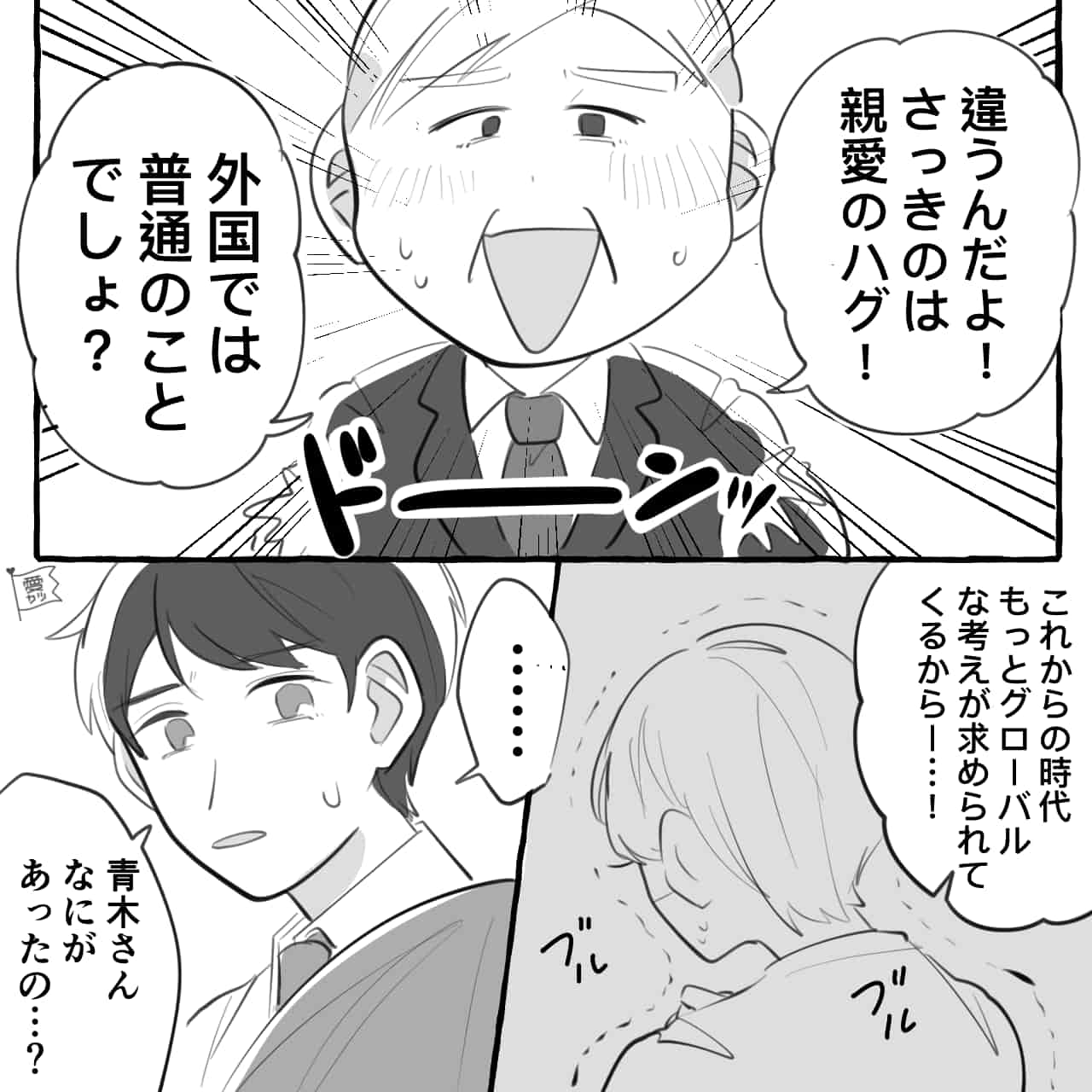 先輩社員に問い詰められると、部長は「さっきのは親愛のハグ!これからの時代、もっとグローバルな考えが求められるから!」と言い訳をします。
