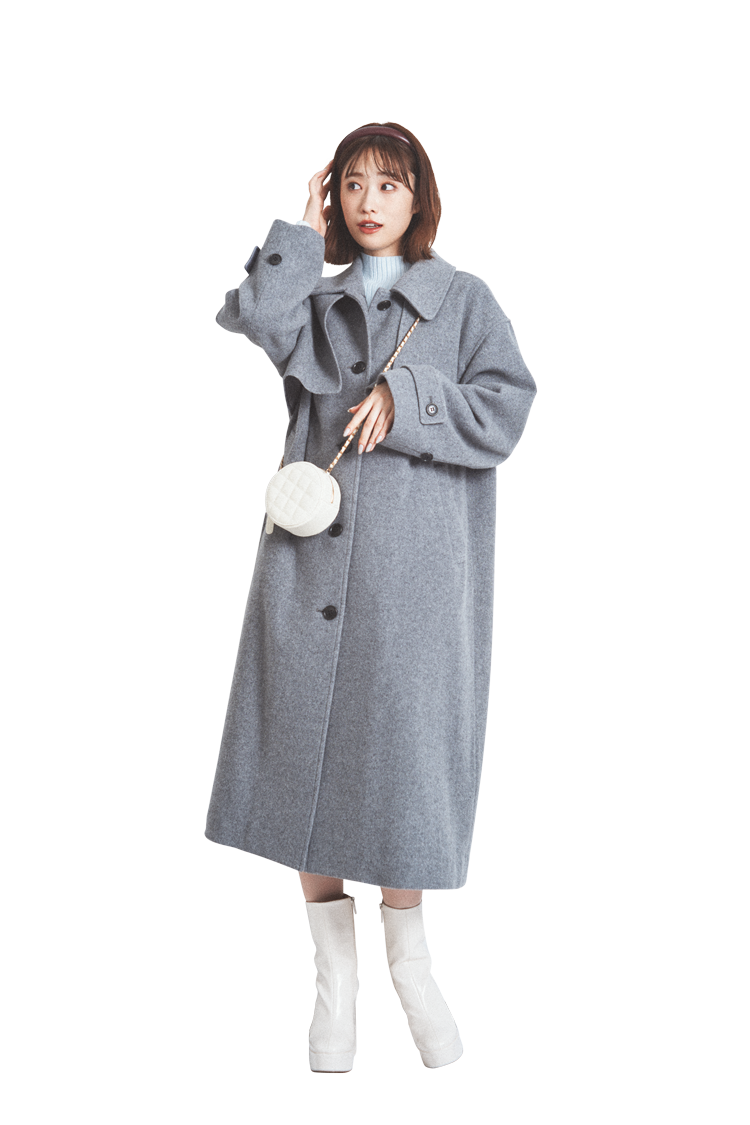 グレーステンカラーコート 39,600円/レイ ビームス(レイ ビームス 新宿) ブルーニット 7,920円/SNIDEL カチューシャ 1,320円/アネモネ(サンポークリエイト) バッグ 2,590円/神戸レタス ブーツ 14,900円/チャールズ&キース(チャールズ&キース ジャパン) Item1 ランニングパンツ