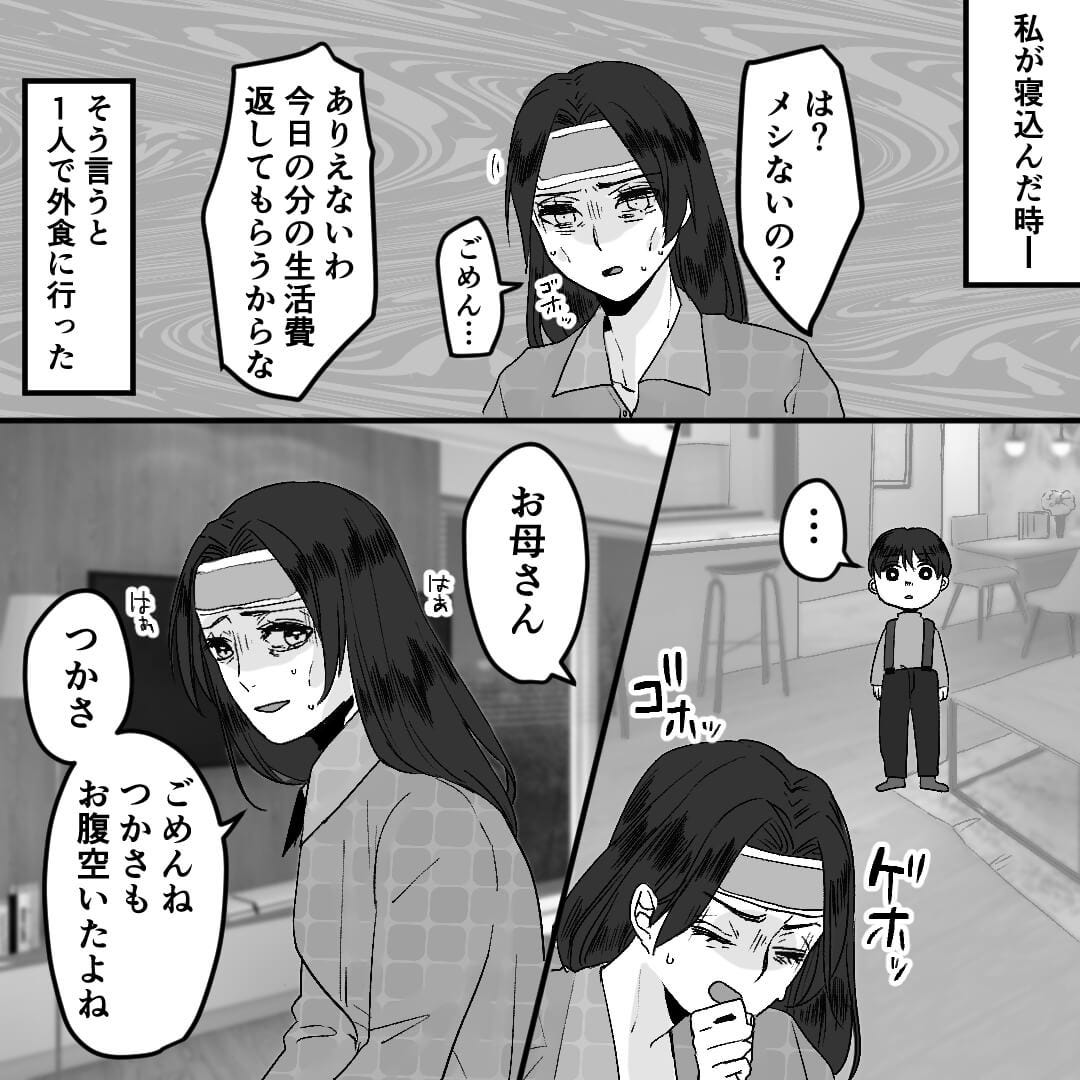 風邪を引いている主人公を置いて、自分だけ外食をする夫に腹が立ちました。 ママ想いの息子の行動に胸がほっこりします。 (30代/女性)夫の態度には呆れてしまいます。 息子が夫に似ていなくてよかったなと思いました。 (20代/女性)※本文中の画像は投稿主様より掲載許諾をいただいています。