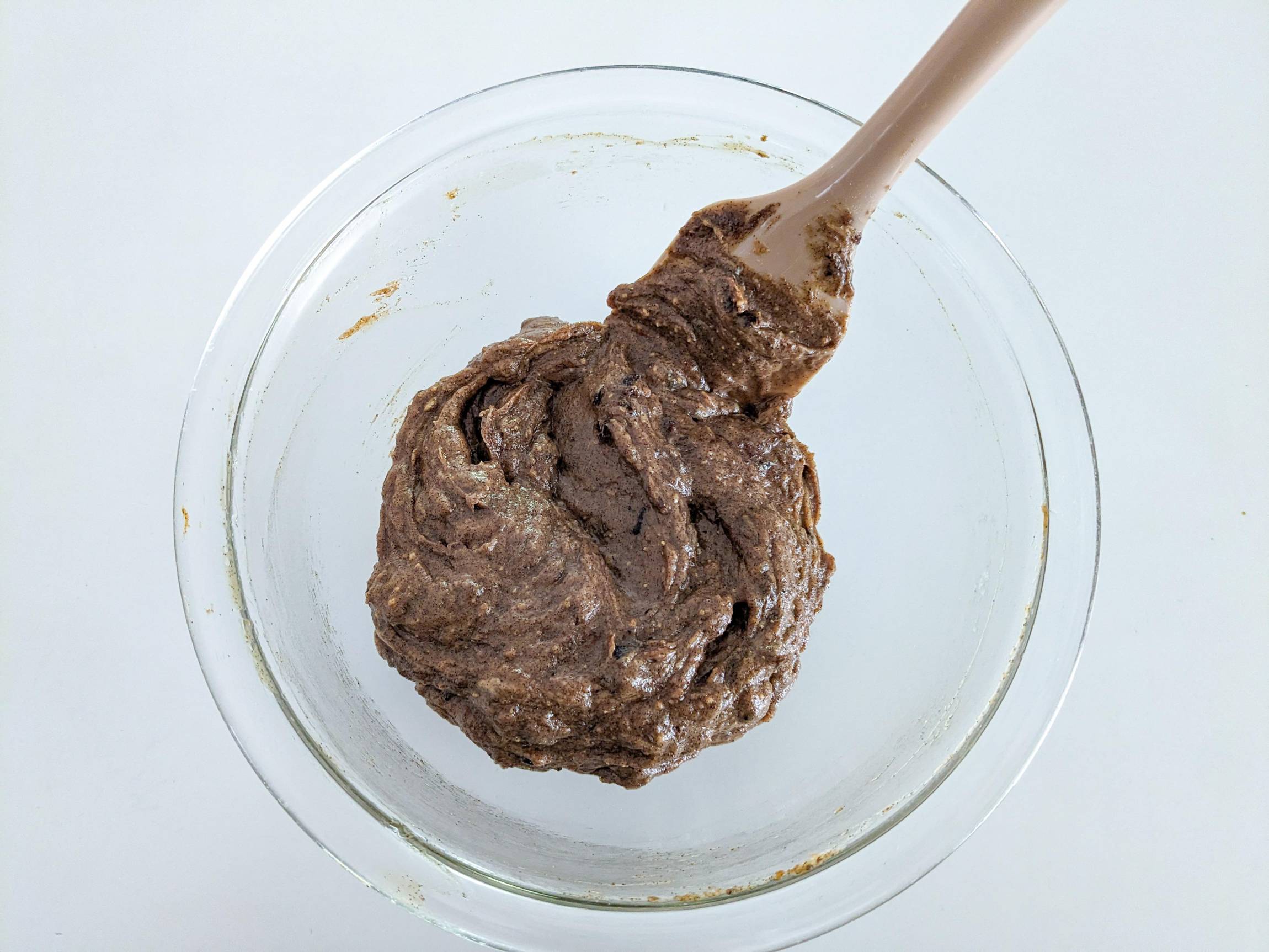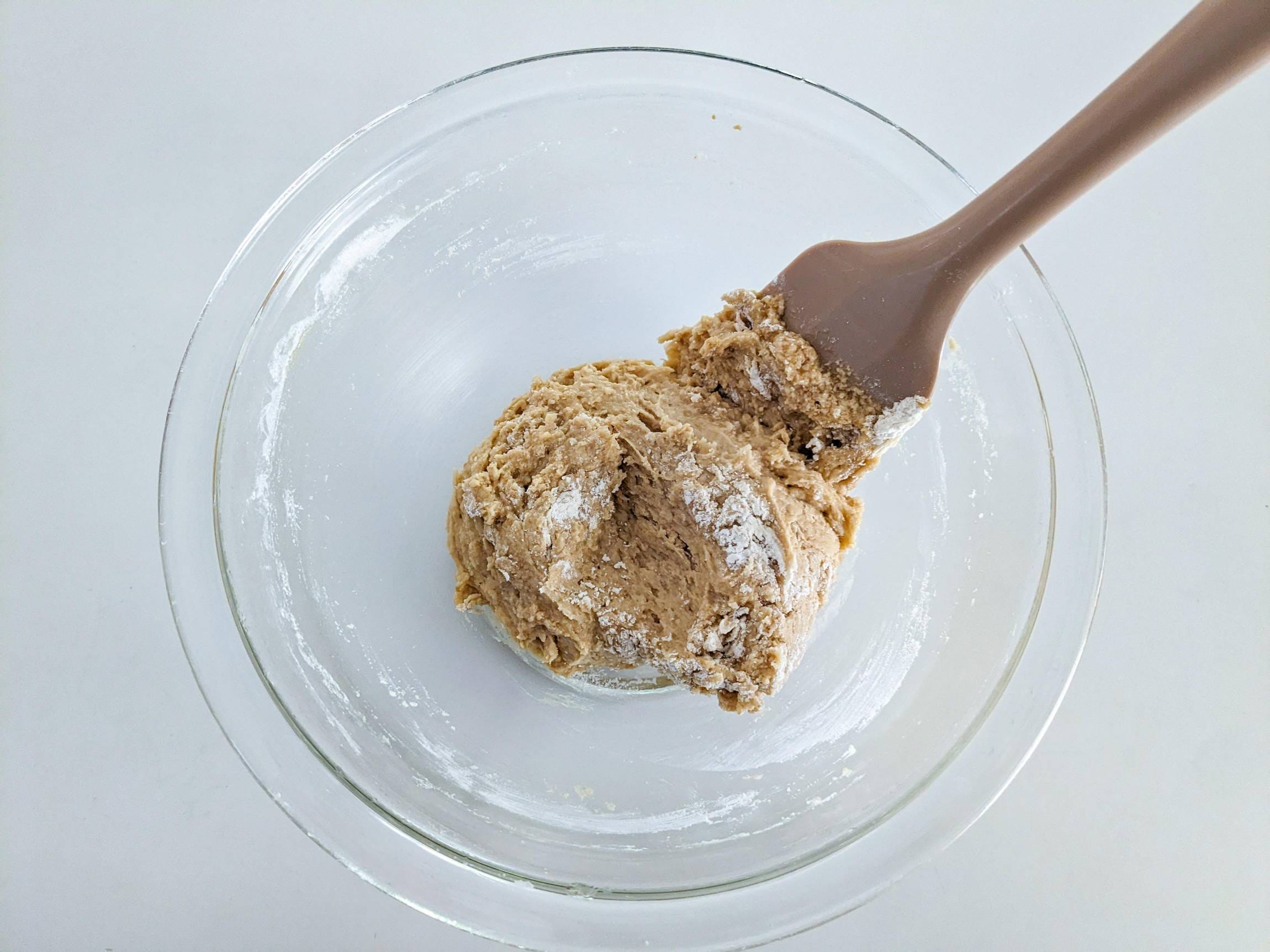 2を加え、生地にツヤが出るまで混ぜ合わせます。バターが溶けてしまうのを防ぐため2は人肌くらいまで冷ましてから加えます。