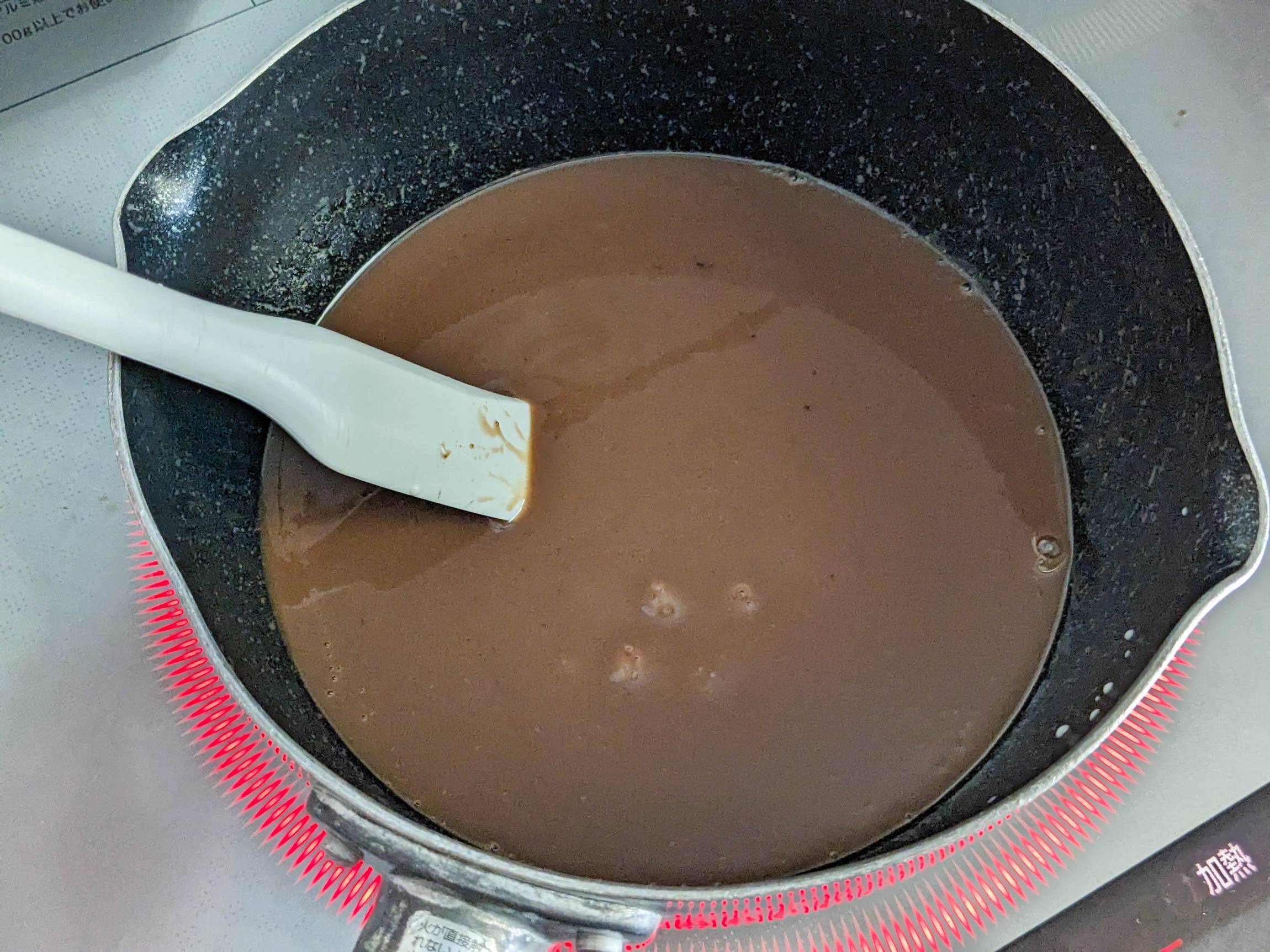 3分ほど煮詰めてトロミがつき、全体がブクブクと煮立ったら火を止めます。