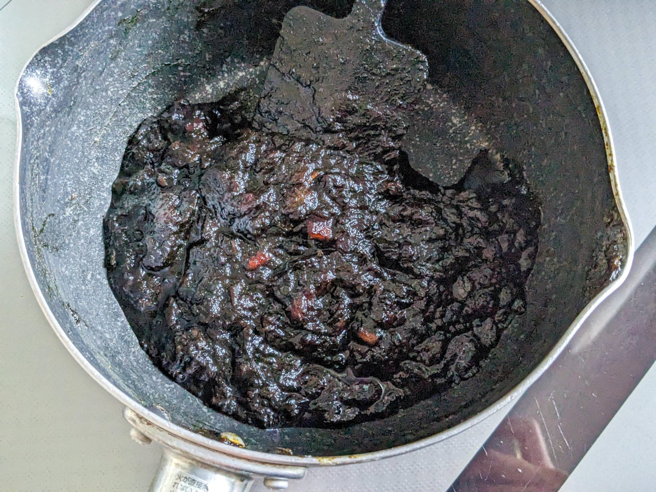 鍋にデーツ、水、重曹を入れて中火にかけます。沸騰してから3~4分煮て、水分がなくなったら火を止めて冷まします。果肉感のあるペースト状になればOKです。