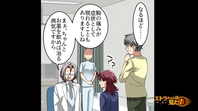 医者に「薬を飲めば治る病気です。様子を見ましょう」と言われ、ほっとする主人公。