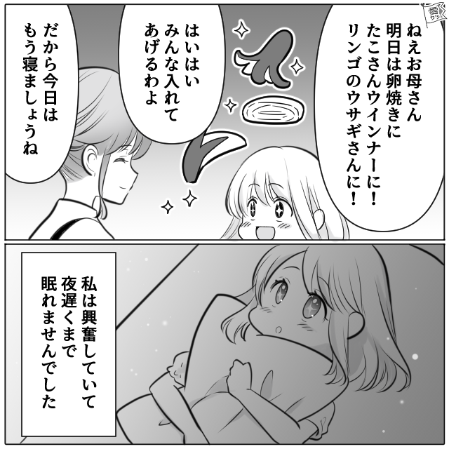 母親はなんと5分で主人公が頼んでいたおかずを入れたお弁当を完成させ、無事遠足に間に合ったのでした。