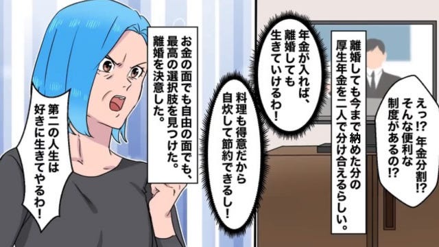 離婚しても今まで納めた分の年金を2人で分ける「年金分割」という制度を知った主人公。