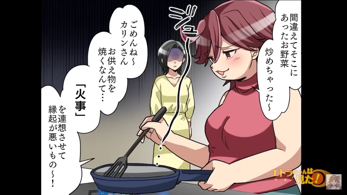 しかし義姉はお供え物をすべて炒めてしまい、唖然とする主人公なのでした。