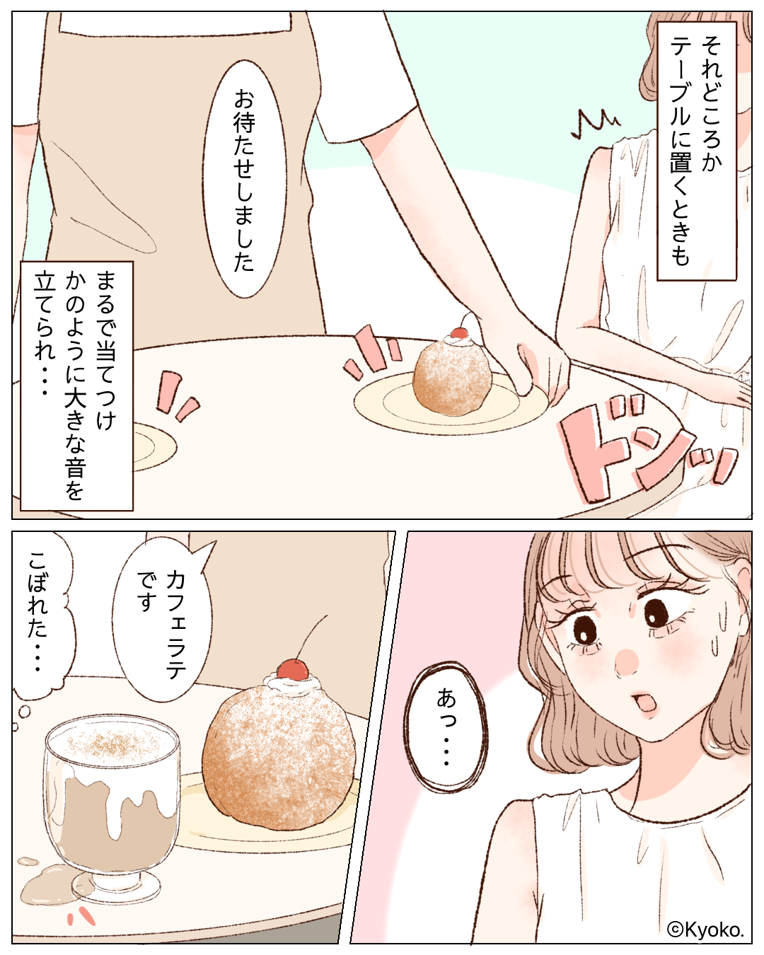 テーブルにこぼれたカフェラテを見て「あっ…」と言葉を失った主人公。
