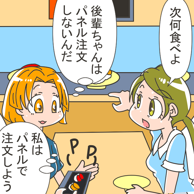 後輩はパネルで注文せずにレーンに流れてくるお寿司を食べていました。