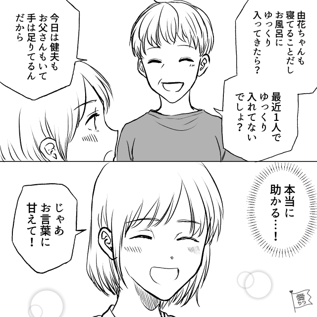 気遣ってくれた義母の言葉に甘え、1人でゆっくりお風呂に入ることができた主人公。
