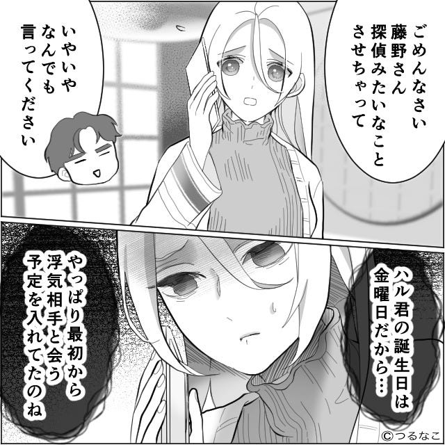 主人公は夫が誕生日を浮気相手と過ごすと考え、夫の同僚に尾行を依頼します。