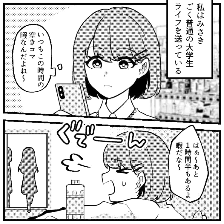 主人公は大学のフリースペースで暇を持て余していると、同じ学科の子・まりなちゃんを見かけます。