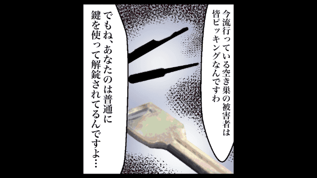 空き巣がピッキングをするのに対し、主人公の家のドアは鍵で開けられていたと言う警察官。