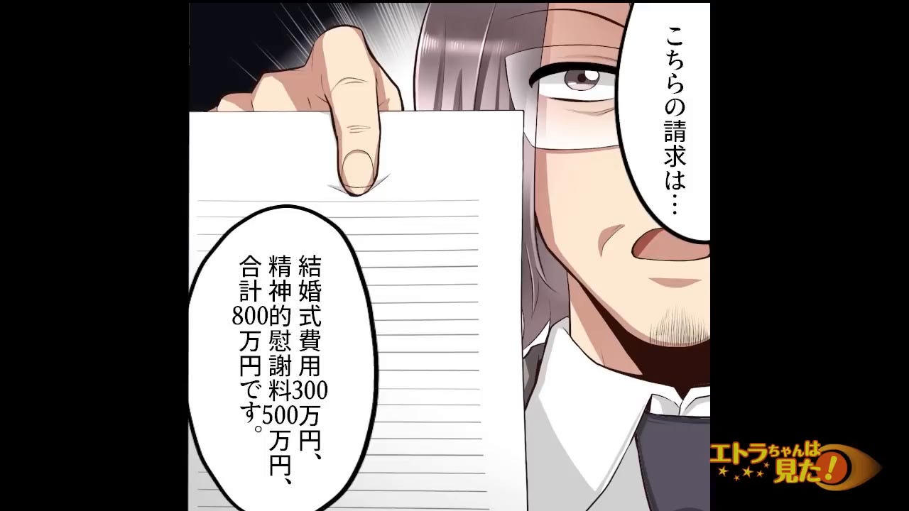 結婚式は中止になり、主人公は女性から慰謝料を請求されます。