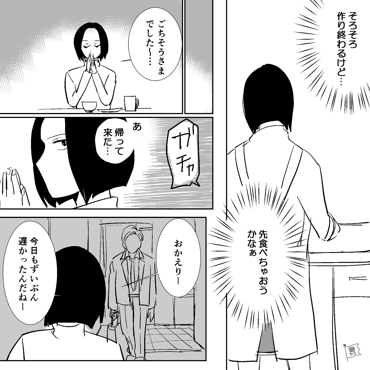 主人公は食事の準備を済ませ、夫より先に食べ始めます。