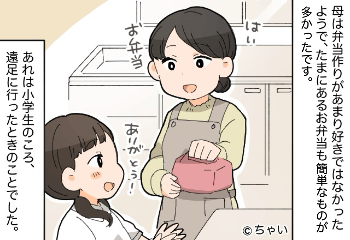 主人公が小学生のころ、遠足の日に母がお弁当を作ってくれました。