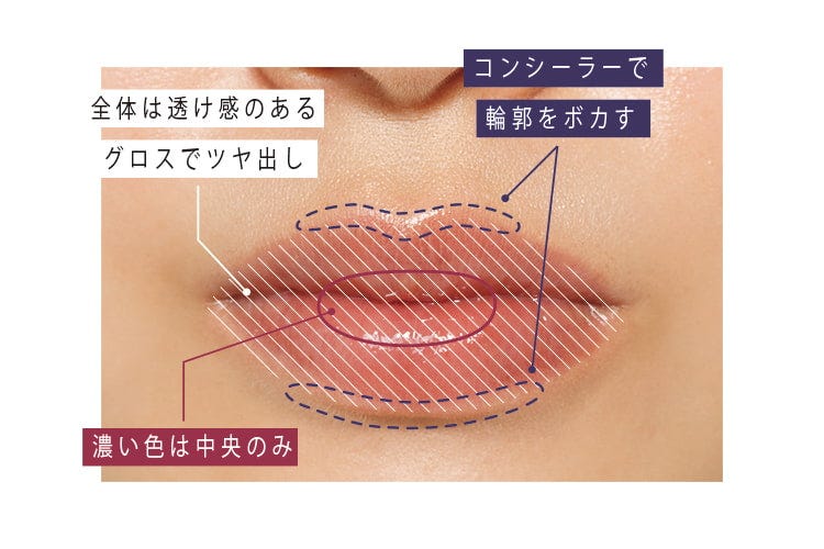 コンシーラーと淡色で唇膨張を阻止!&ツヤで盛ってうぶ感急上昇唇の輪郭をちょっぴりボカして、ブラウンを唇の中央にだけ仕込む。仕上げに淡色のツヤを足すことでプチッと可愛いバブみが誕生♡