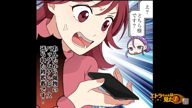 「傷物の服を送られた被害者です」と主張し、主人公を責めた女性。