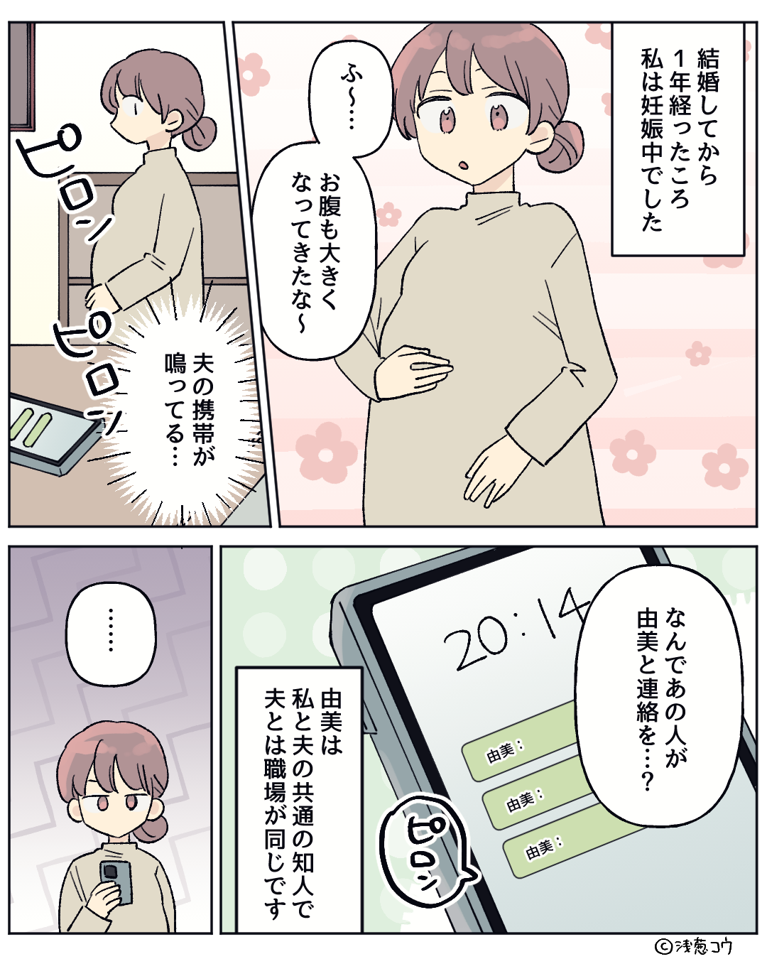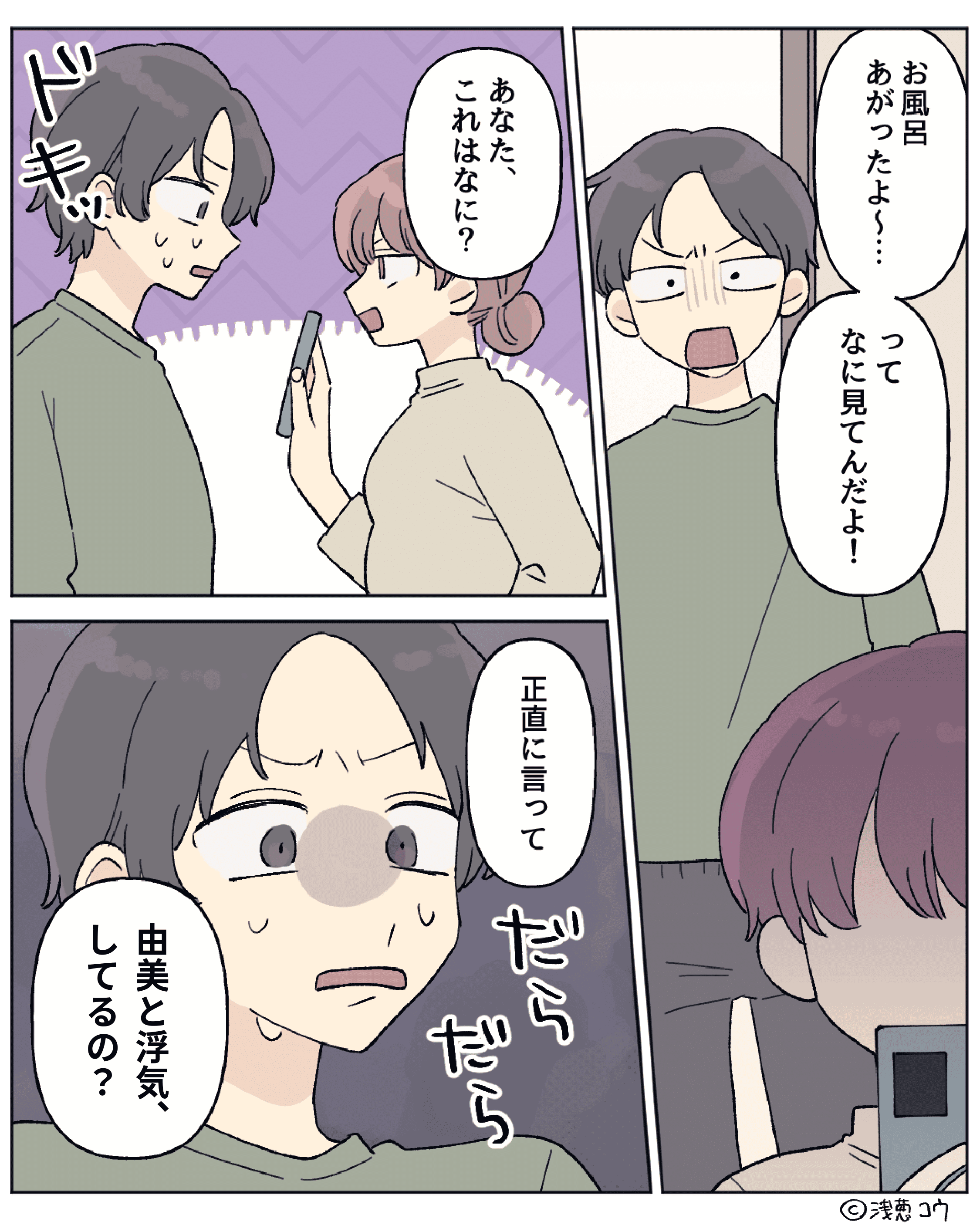 夫が同僚と浮気していると察した主人公は、直接話を聞くために同僚を呼び出しました。