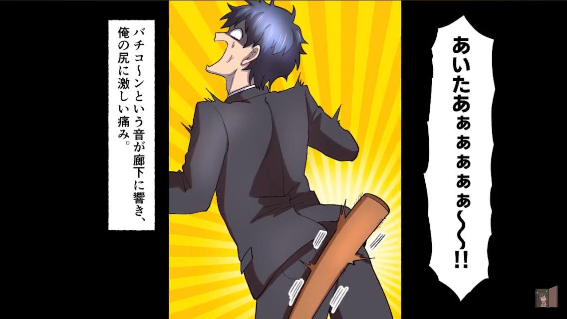 次の瞬間、背中に衝撃が走り「いたあああい!」と絶叫する主人公。