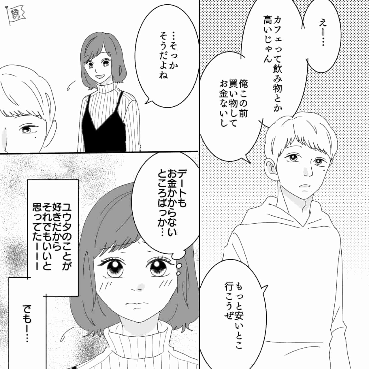 金遣いが荒く貯金がない彼氏、主人公とのデート代も安くすませようとします。