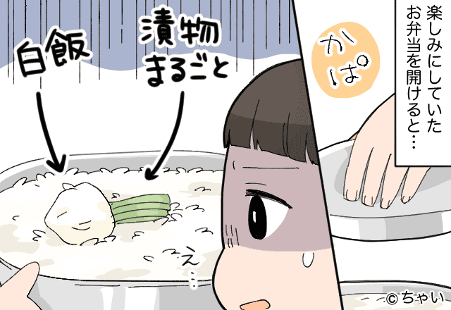漬物と白米だけという斬新なお弁当を見て、言葉を失った主人公。