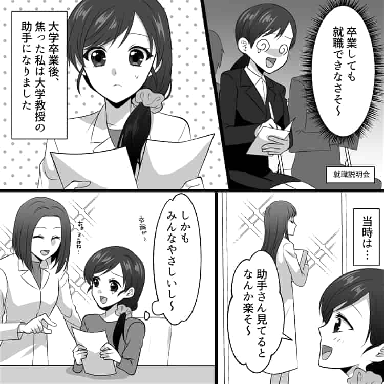 学生時代に楽そうだと思い、助手になった主人公でしたが意外とハードで……?