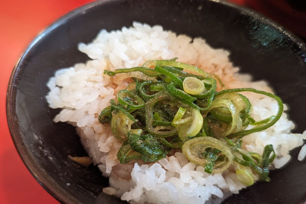 同店ではライス食べ放題が100円とリーズナブルなだけでなく、海苔のトッピングも100円と格安。シャキシャキの九条ねぎに濃いめのスープ、ライスとの組み合わせは極上だ。