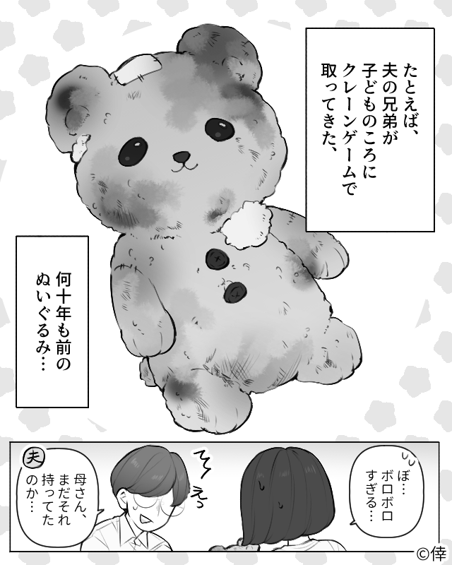 夫の兄弟が子どものころにクレーンゲームでとったぬいぐるみを持ってきた義母。