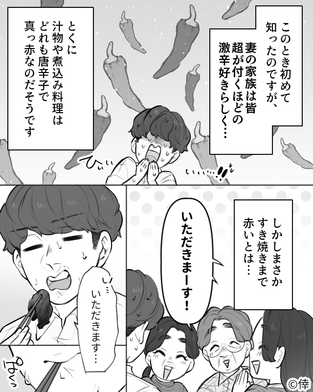 このとき義家族が、超がつくほどの激辛好きだったことを知った主人公。