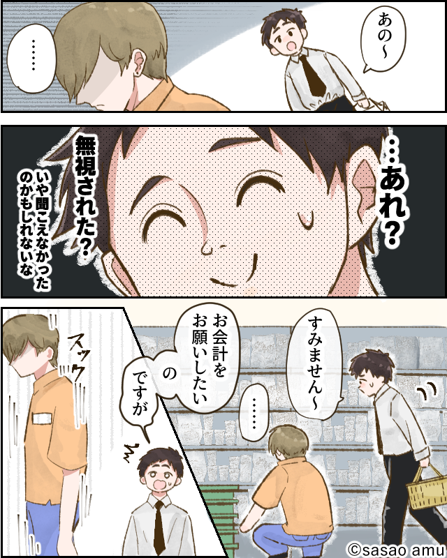 会計をしたかった主人公が、品出し中の店員に声をかけると…。