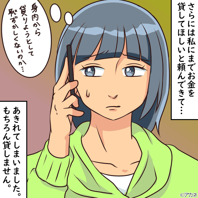 夫は「俺は貸せないよ」ときっぱり断りましたが、義姉は主人公にまで「お金を貸してほしい」と頼んできたのです。