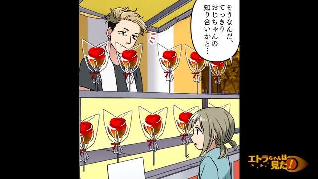 女性にお礼を言った主人公は、りんご飴の屋台の店主にもお礼を言いに行くことにします。