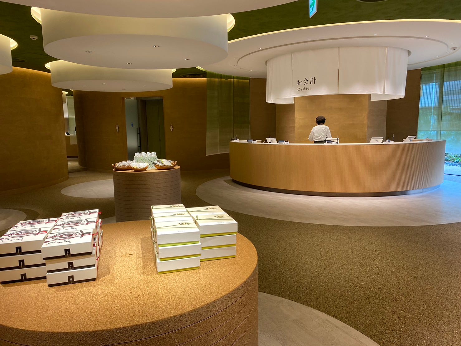 施設内は「京都」「抹茶」「バームクーヘン」というテーマを感じられる仕掛けが随所に盛り込みまれています。特に1階のショップでは商品が置かれた什器はバームクーヘンをイメージしていたり、のれんには京ばあむを作るときにも使われる抹茶で色付けがされていたりと商品を選ぶワクワク感もさらに高まる空間となっています。